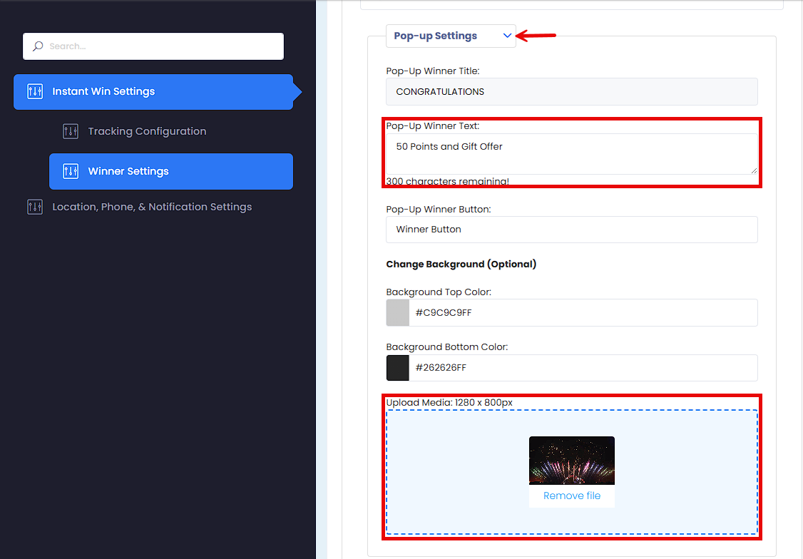 You can choose the pop-up settings, which is the text to display to the winning member. You can also choose what type of background image or video you would like to display.