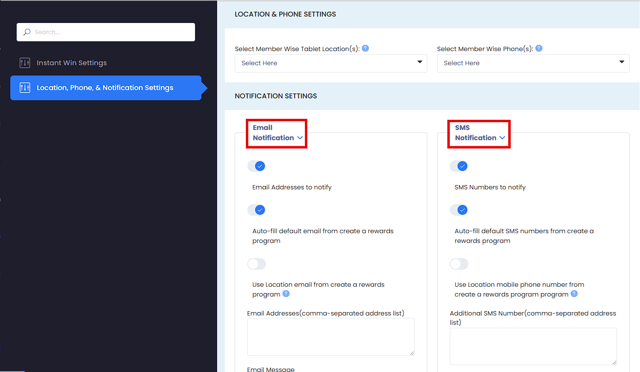 On the Location, Phone, and Notification Settings, for each tablet we'd like to participate in the program, we can select here and the same for each phone. As you can see, we do not have any phone for the program. We can also receive Email and SMS notifications for each winner by choosing the options here.